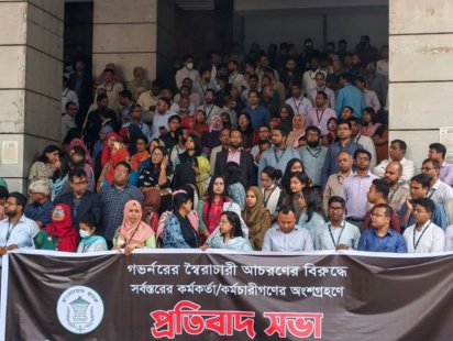 আজ বুধবার সকাল ১১টার দিকে কেন্দ্রীয় ব্যাংকের প্রধান কার্যালয়ের সামনে তারা এই কর্মসূচি পালন করেন। কর্মকর্তা-কর্মচারীরা গভর্নরের বিরুদ্ধে ‘স্বৈরাচারী আচরণের’ অভিযোগ তোলেন।